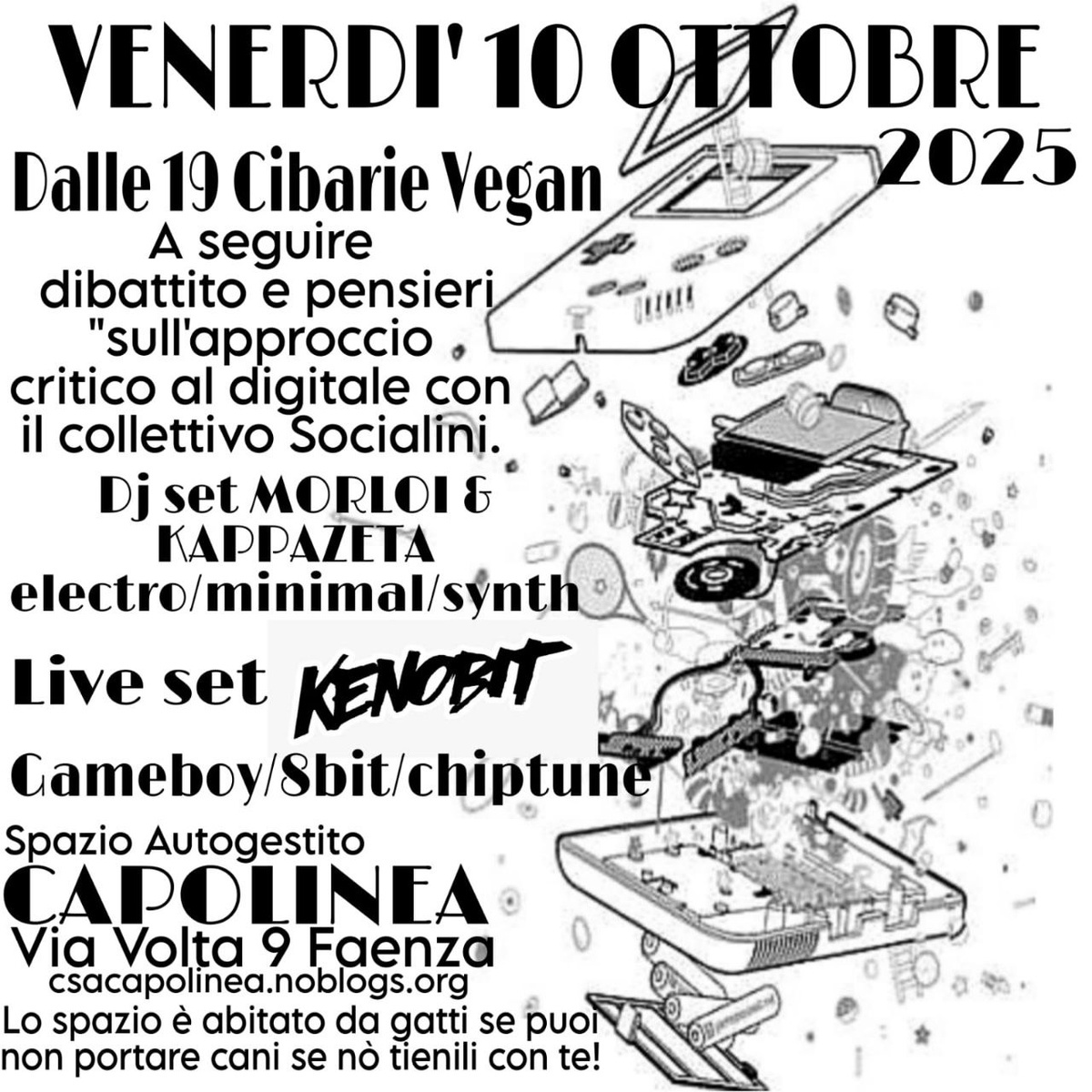 raccontano la necessità di un approccio autoeducativo per adolescenti e adulti, per andare oltre alle piattaforme e alla tossicità delle proposte commerciali, in un percorso di riappropriazione degli spazi digitali, lontani dalle logiche capitalistiche.dalle 21 DjSet Morloi & Kappazeta selezioni electro/minimal/synth ,