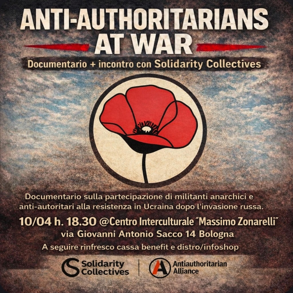 Anti-Authoritarians at War racconta la partecipazione di militanti anarchici e anti-autoritari alla resistenza in Ucraina dopo l’invasione russa. Il documentario segue l’esperienza di combattenti e volontari che hanno scelto di organizzarsi in modo autonomo e solidale, mostrando sia la dimensione militare sia quella politica e mutualistica della resistenza. Dopo la proiezione ci sarà un dibattito con una compagna di Solidarity Collectives, rete impegnata nel sostegno ai combattenti e alle iniziative solidali sul campo.