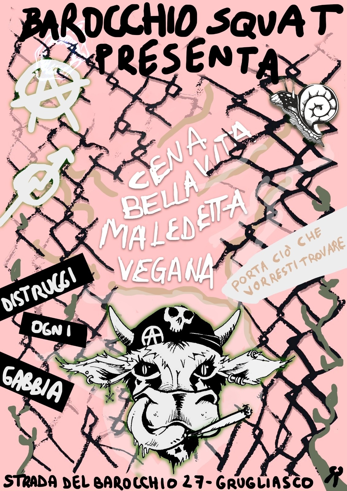 Barocchio squat presenta una semplice proposta per ribadire l'importanza della responsabilità individuale e collettiva sul tema dell'alimentazione, in specifico quella a base vegetale, come mezzo per portare avanti la liberazione animale in un contesto atroce che vede la mercificazione degli esseri animali per vari scopi beceri, come il divertimento, l'intrattenimento, secondo la logica di sfruttamento generale di questi ultimi.