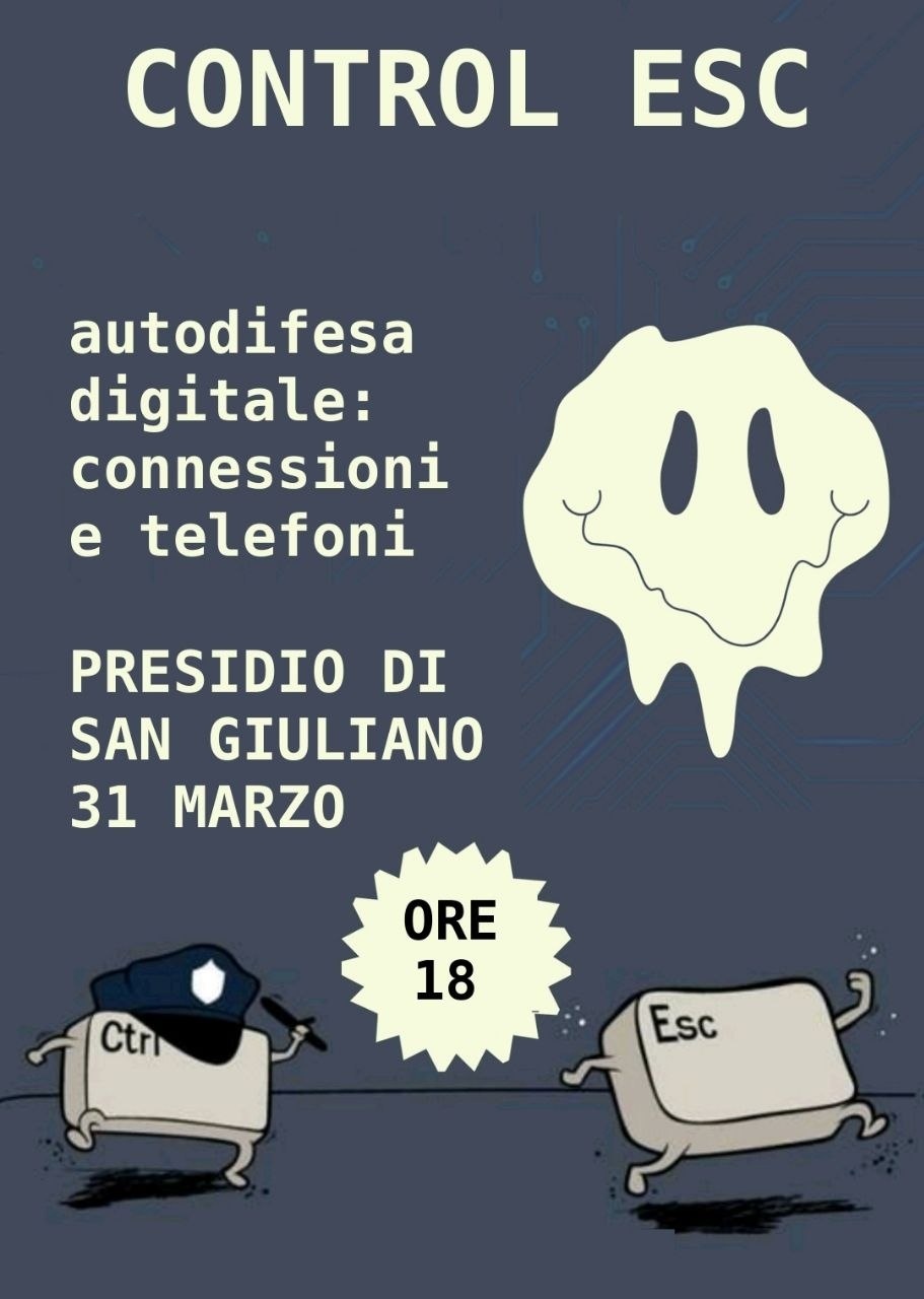 Martedì 31 marzo alle 18 ci ritroveremo al presidio di san Giuliano per un primo incontro che verterà sul tema dell'autodifesa digitale, parleremo di come proteggere i nostri smartphone con semplici accorgimenti per difenderci da occhi indiscreti o in caso di situazioni spiacevoli.Condivideremo consigli pratici che si possono adottare più o meno facilmente e ci sarà modo di sperimentare assieme e testare la sicurezza dei nostri dispositivi.
