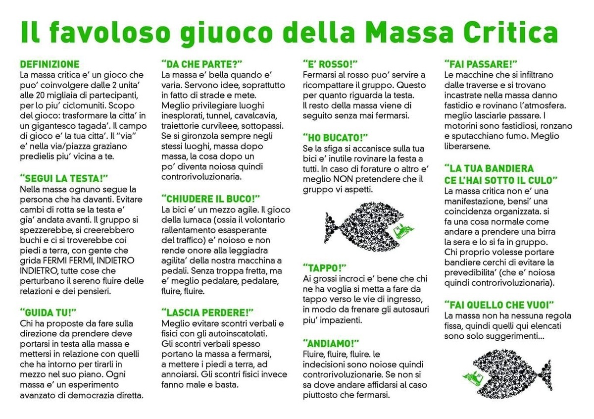 Il volantino è formato da qualche paragrafo che spiega come sarebbe carino comportarsi in Critical Mass e contiene l'immagine, ripetuta due volte, di un grande pesce, composto da tante biciclette, che mangia una ruspa.