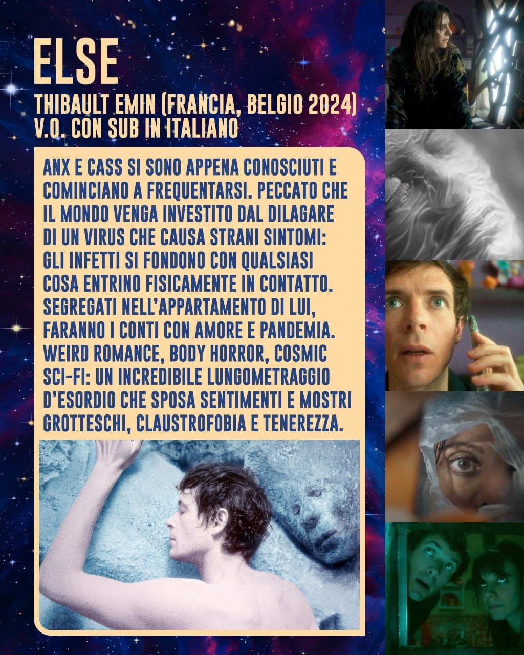 Descritto come uno dei debutti più originali del cinema di genere francese degli ultimi anni, vincitore di premi per la regia e gli effetti speciali a Sitges e Screamfest, Else è un viaggio sensoriale che trasforma una storia d’amore in un incubo biologico e filosofico, esplorando il confine tra l’essere umano e la materia inanimata, una metafora estrema sulla perdita dell’io a favore dell’Altro.