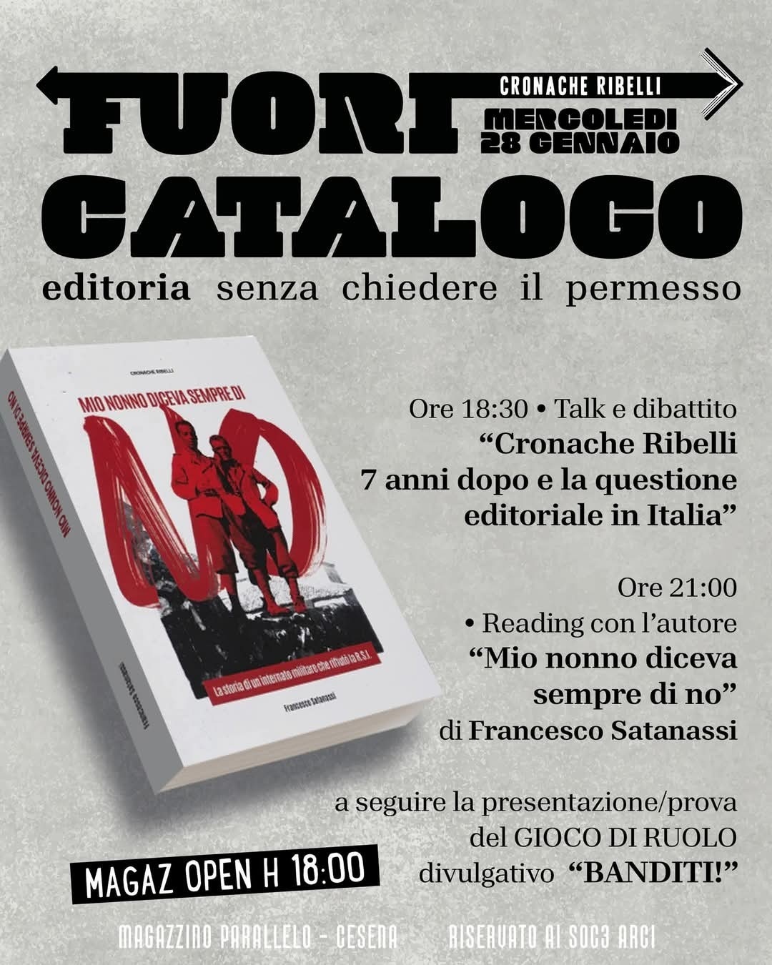 https://www.fuorinellanebbia.it/event/fuori-catalogo-cronache-ribelliMagazzino Parallelo, 70, Via Genova, Quartiere Cervese Sud, Cesena, Unione dei comuni Valle del Savio, Forlì-Cesena, Emilia-Romagna, 47521, Italia