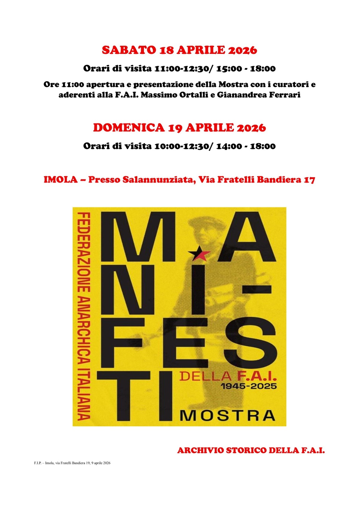 Imola - Mostra Manifesti della F.A.I. 1945-2025 - SABATO 18 APRILE & DOMENICA 19 APRILE 2026