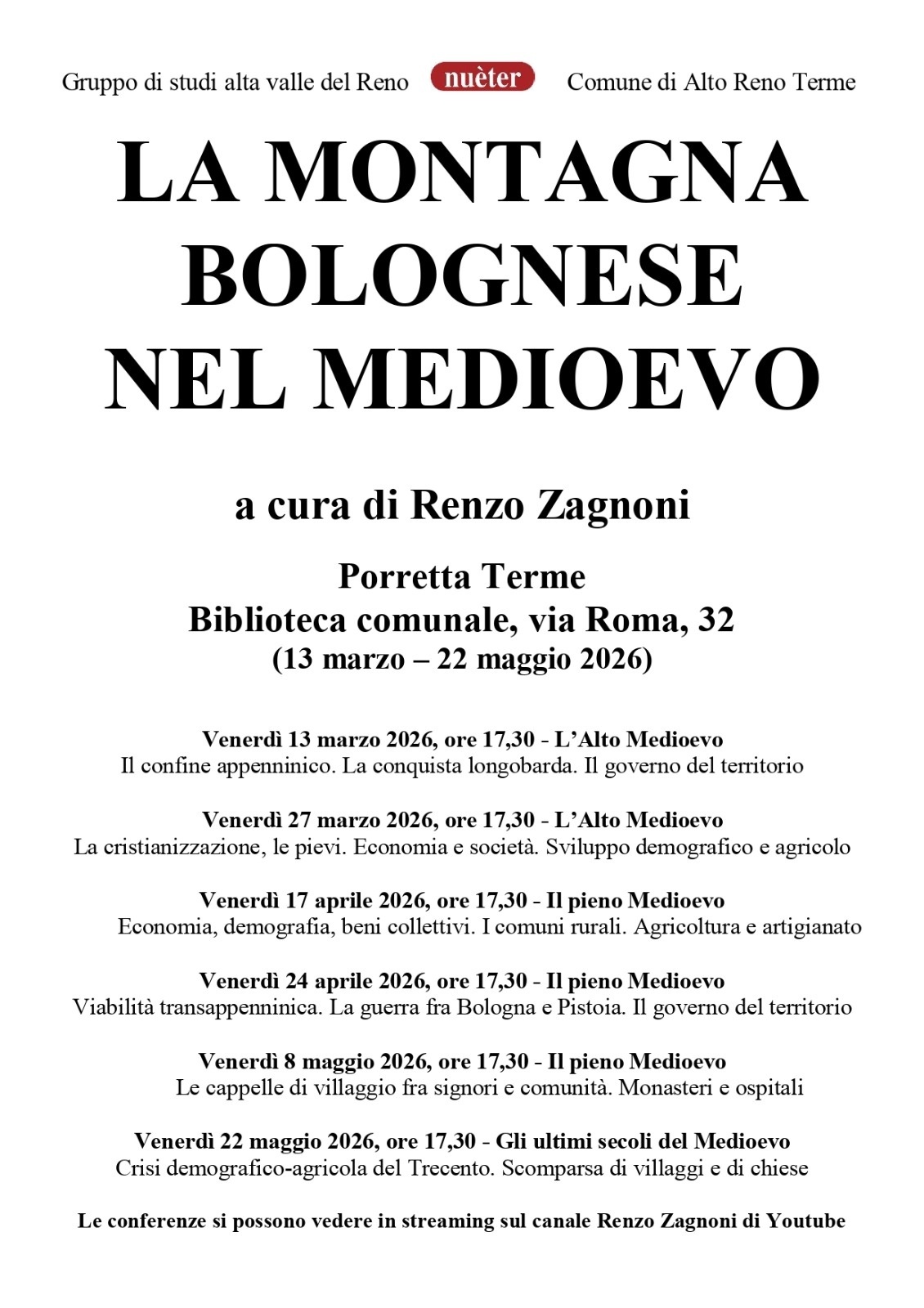 La montagna bolognese nel Medioevo è il titolo di un ciclo di incontri dedicati alla storia dell’Appennino bolognese, che si terrà nella primavera 2026 a Porretta Terme. L’iniziativa, curata dallo storico Renzo Zagnoni, è promossa dal Gruppo di studi Alta Valle del Reno “Nuèter” con il patrocinio del Comune di Alto Reno Terme.