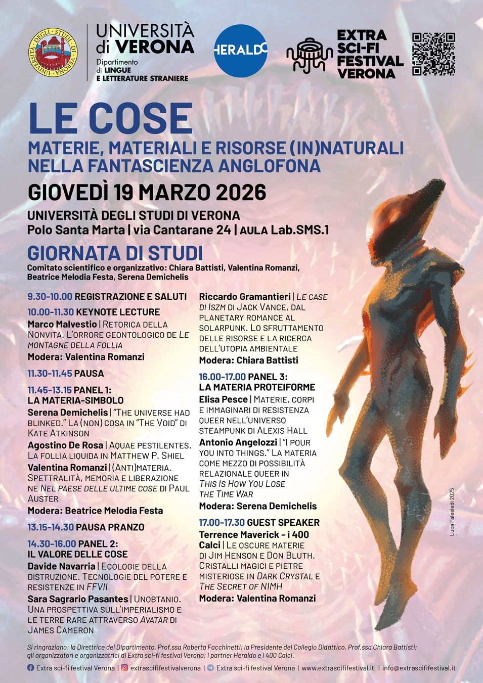 La giornata di studi “Materie, materiali e risorse (in)naturali nella fantascienza anglofona” intende approfondire il ruolo dei materiali e delle risorse con attenzione alla loro dimensione simbolica, narrativa, ecologica e politica. L’evento si propone di accogliere contributi interdisciplinari provenienti da letteratura, cinema, media digitali, studi culturali e scienze naturali, con l’obiettivo di comprendere come la fantascienza utilizzi la materia per costruire mondi coerenti, eticamente complessi e narrativamente ricchi.