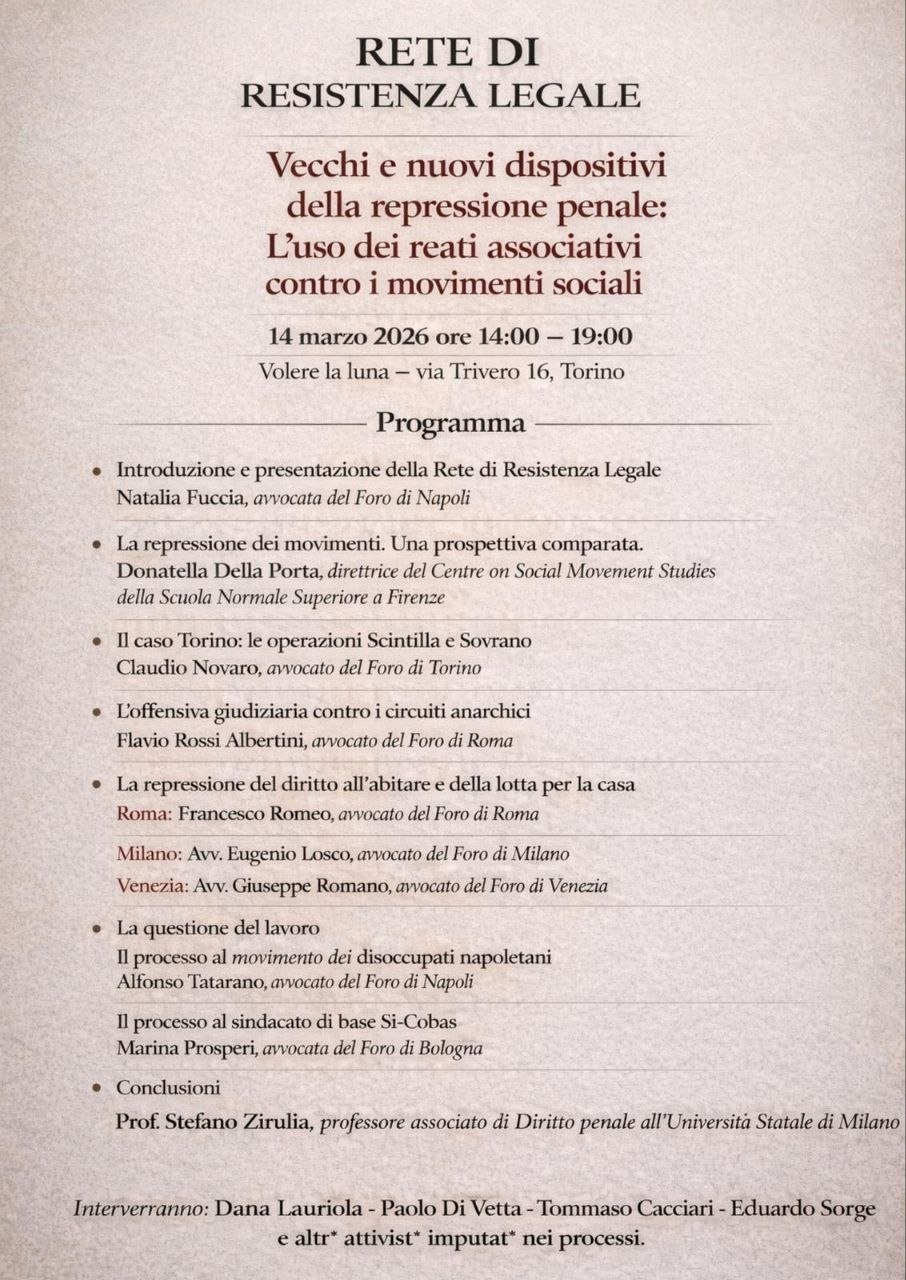coordinarsi e a ragionare collettivamente su come opporsi allβattuale torsione autoritaria in ambito giudiziario, soprattutto in riferimento ai processi legati alla conflittualitΓ e alla protesta sociale.