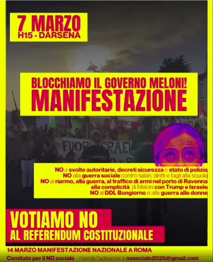 Vogliamo costruire una mobilitazione cittadina continua, che passi per il corteo del 7 marzo, converga a Roma il 14 marzo per la Manifestazione nazionale del no Sociale, e culmini alle urne nelle giornate del 22 e 23 marzo. Invitiamo Ravenna a esserci, con una presenza visibile e collettiva: perché una battaglia democratica non si vince da soli, e perché i territori contano quando si muovono insieme.