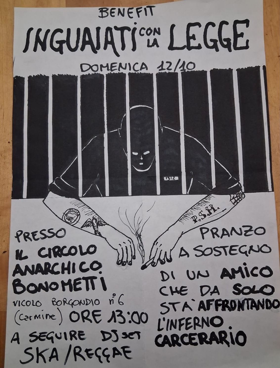 Domenica 12 ottobre il circolo ospiterà un pranzo benefit, tutto il ricavato andrà a sostegno di un amico prigioniero. Nel corso della giornata di set ska/reggae.