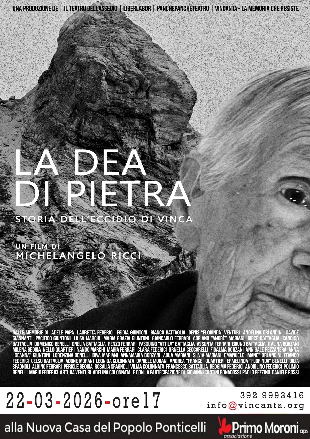 Il docufilm “La Dea di Pietra - storia dell’eccidio di Vinca” nasce da anni di frequentazione con il paese di Vinca, con i suoi abitanti e con la loro storia profondamente segnata dall’eccidio nazifascista dell’agosto 1944. Attraverso la partecipazione attiva della comunità è stato possibile raggiungere e intervistare trentasette superstiti. Grazie al contributo di Giovanni Contini, pioniere della storia orale in Italia, sono state integrate nel docufilm altre diciotto testimonianze da lui raccolte nei primi anni Duemila. Gli storici Daniele Rossi e Paolo Pezzino intervengono inoltre per arricchire il racconto con approfondimenti di ricerca volti a indagare gli elementi di peculiarità della strage di Vinca, inserita nel contesto delle numerose stragi perpetrate lungo la Linea Gotica. “La Dea di Pietra - storia dell’eccidio di Vinca” introduce elementi di novità in relazione al coinvolgimento diretto delle Brigate Nere della vicina città di Carrara, avanzando ipotesi storiche che aprono a nuovi interrogativi.