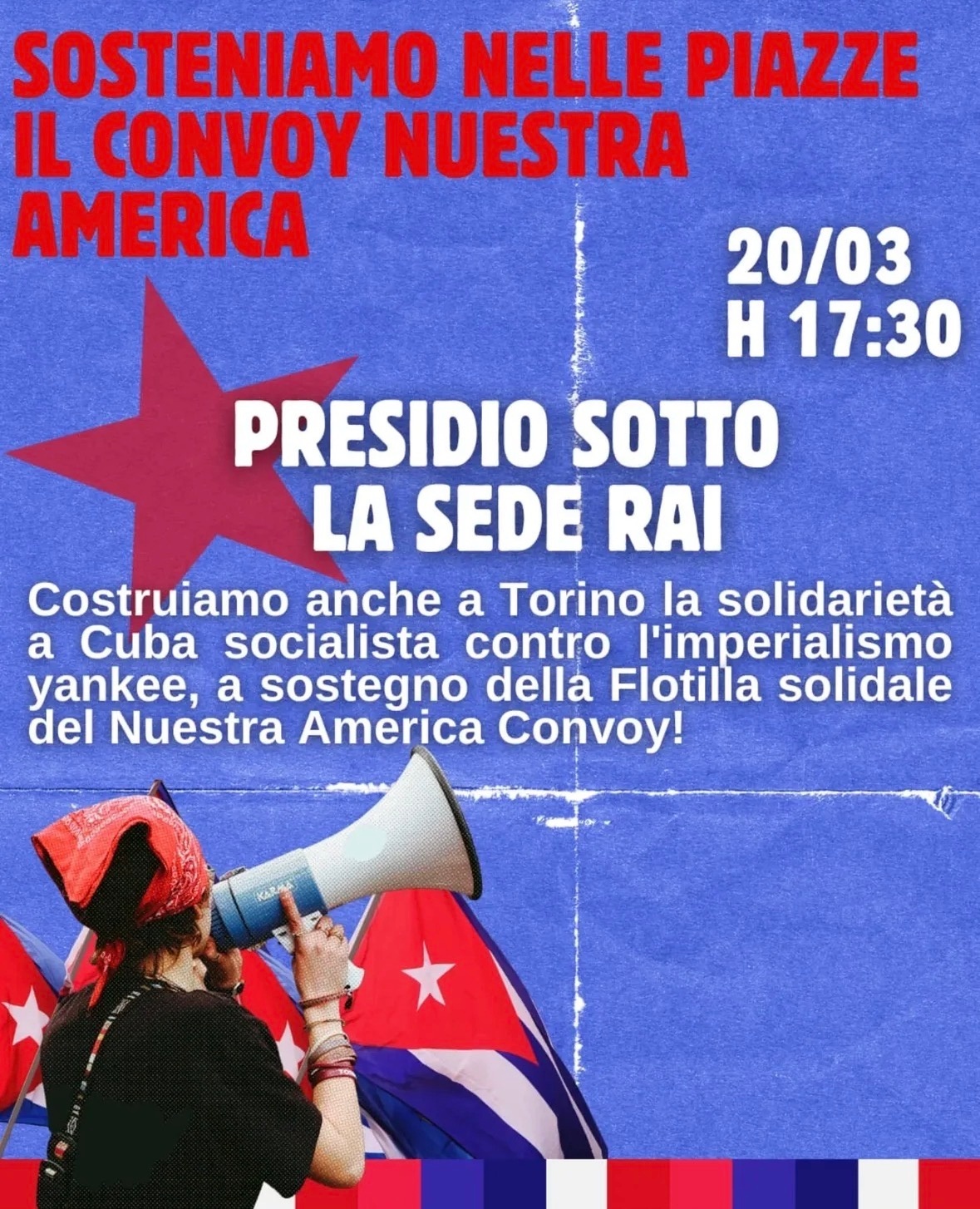 Per questo il 20 marzo alle 17:30 saremo in presidio davanti alla Rai (Via Verdi 16), a sostegno del Convoy solidale che arriverà il 21 marzo a L'Avana e contro la complicità del governo Meloni con il bloqueo criminale imposto dagli Stati Uniti.