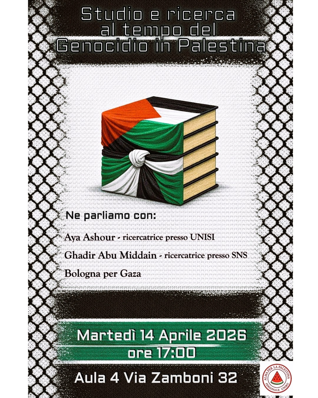 In continuità con il percorso avviato nelle importanti giornate di sciopero di settembre e ottobre 2025 e con l’iniziativa dello scorso novembre con il dissidente israeliano Ronnie Barkan, come Alma per la Palestina proponiamo un momento di informazione e confronto con “Bologna per Gaza” e con due ricercatrici palestinesi Aya Ashour e Ghadi Abu Middain. Ascolteremo testimonianze e analisi sull'accesso all'istruzione dei e delle palestinesi e sui loro percorsi nelle università italiane negli ultimi anni, sulle dinamiche che li regolano, con uno sguardo agli effetti del genocidio in corso in Palestina.