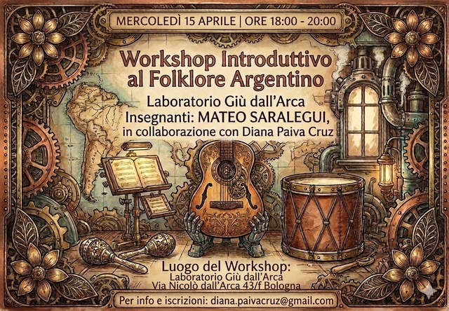 Workshop aperto a tuttx anche ai non musicisti. In seguito il concerto in duo di Diana e Mateo. L’intenzione è di condividere con la comunità di Bologna un’introduzione alla storia della musica folklorica argentina a partire da una prospettiva sia musicale che socio-culturale. La prima parte sarà dedicata alle curiosità, alla storia e alle origini di questa musica, faremo alcuni ascolti per comprendere la varietà di stili e le sonorità. Nella seconda parte porteremo tutto alla pratica approcciando qualche brano tipico del folklore attraverso il canto, la body percussion, la ritmica del bombo leguero e della chitarra (se qualcuno desidera portarla). Non c'è bisogno di venire con strumenti musicali. Il tutto partendo da un livello base.