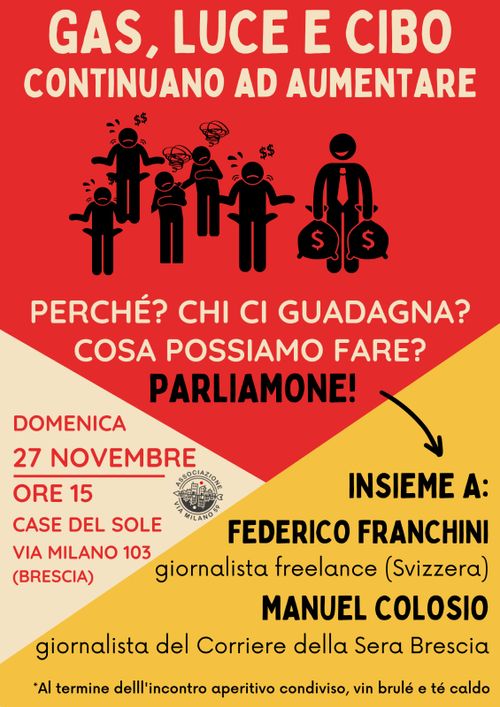 Chi Guadagna dagli Aumenti di Cibo, Luce e Gas? Sunday, Nov 27, 2022, 03:00 PM-05:00 PM Sunday 27 November 17:00 Case del Sole via Milano 103, Brescia aiutocarovitaciboconferenzaculturagas